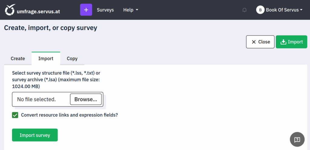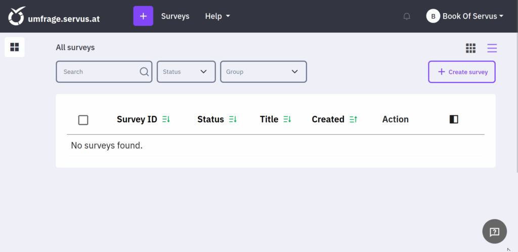- Du benötigst Zugriff auf eine Instanz von Limesurvey (z. B. umfrage.servus.at).