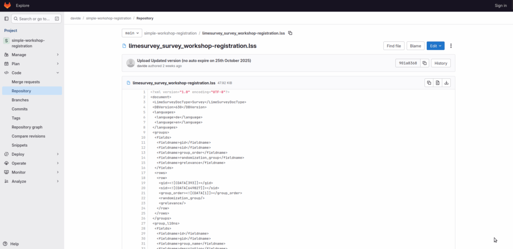 (https://gitlab.servus.at/davide/simple-workshop-registration/-/blob/main/limesurvey_survey_workshop-registration.lss). - Logge dich bei Limesurvey ein