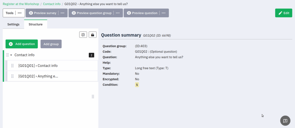 - Ändere und passe den Titel, die Beschreibungsseite sowie die Begrüßungs- und Abschlussnachricht an. Erweitere die Umfrage falls nötig.
